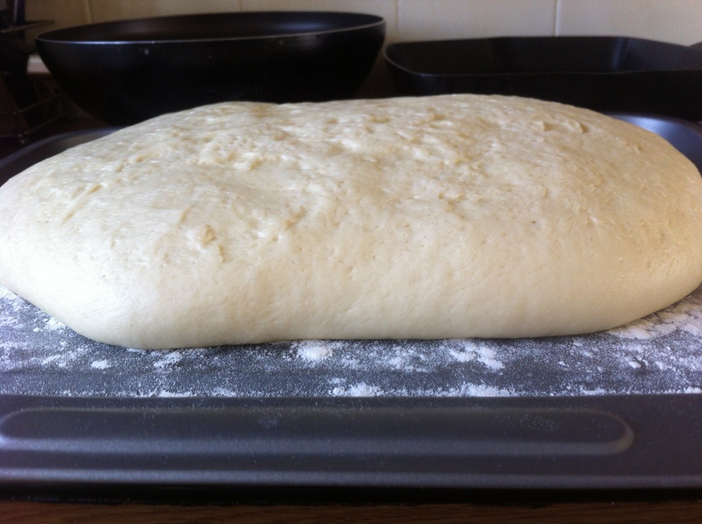 Stick the oven on to 200°c and flour a large baking tray. Roll or press the dough out to around an inch thick, very lightly oil an cover with clingfilm, making sure it’s airtight.