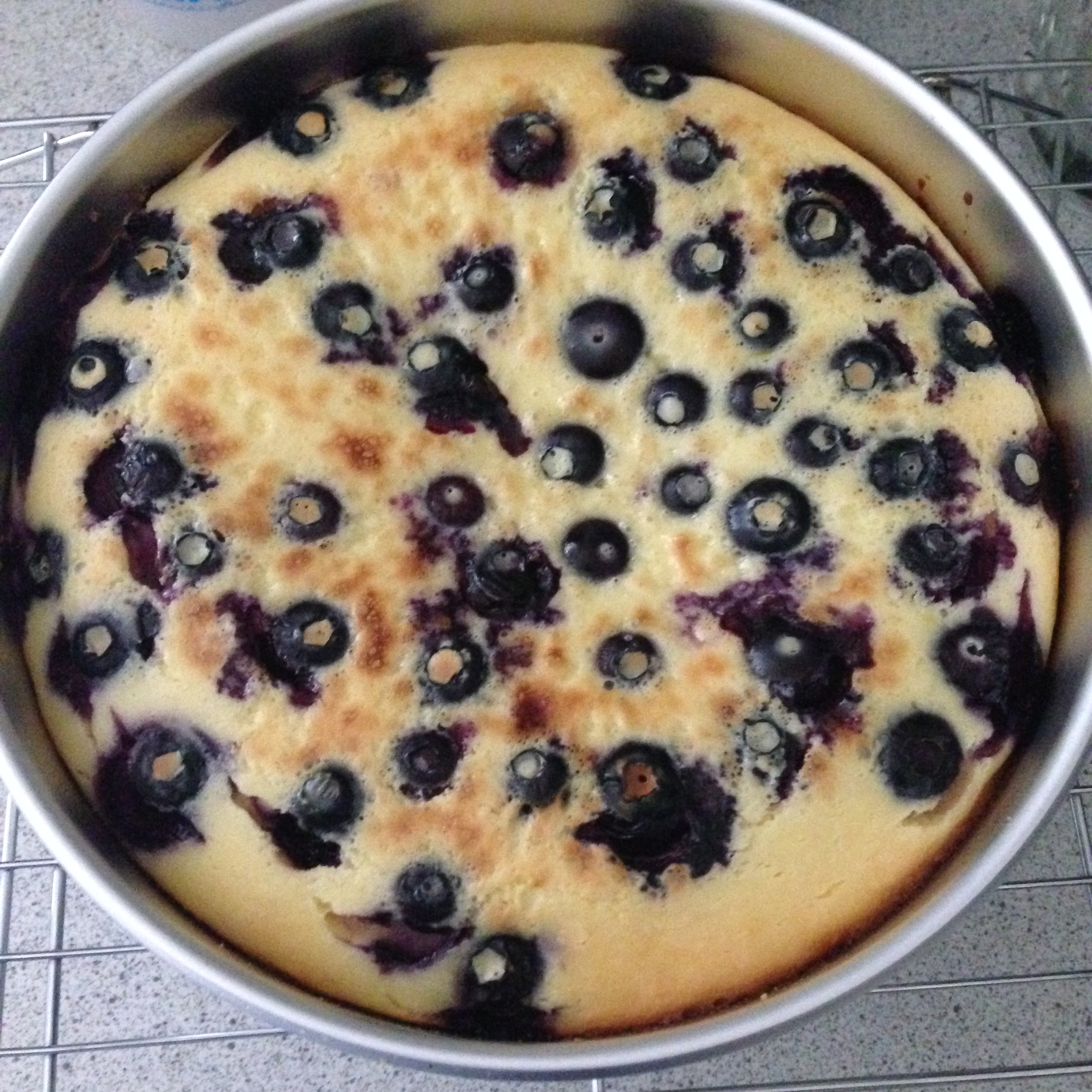 Pour into your cake tin over the base and then scatter the blueberries over the top. Try and make sure they aren’t all just in one clump.