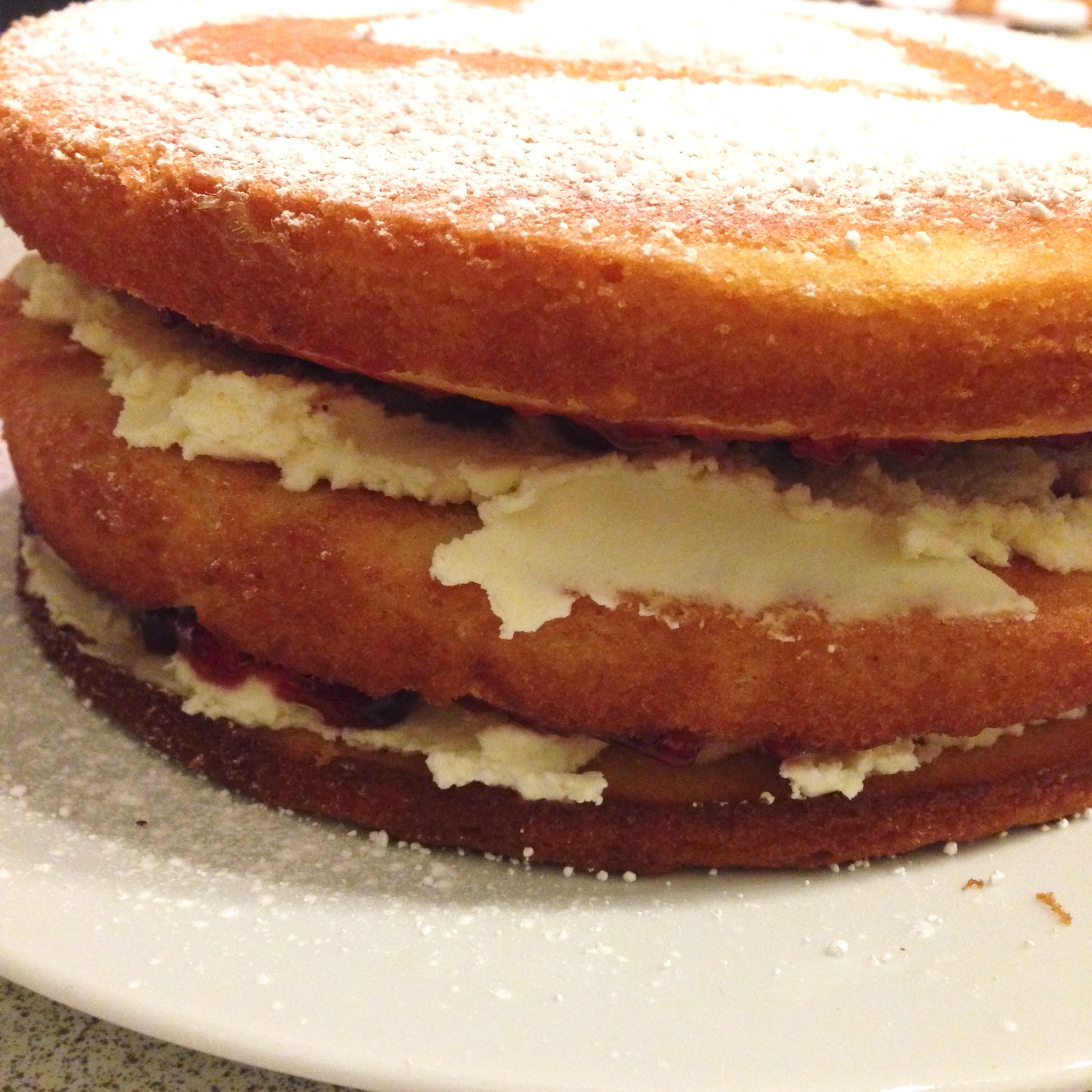Let them cool completely and whip your cream until it’s very, very thick. Spread half of it over one of the cakes and then spread a thin layer of jam over the bottom of your next layer. Squish together. Add the rest of your cream on top, cover the bottom of the last cake with jam, plonk on top and dust with icing sugar. Do this neater than I did.