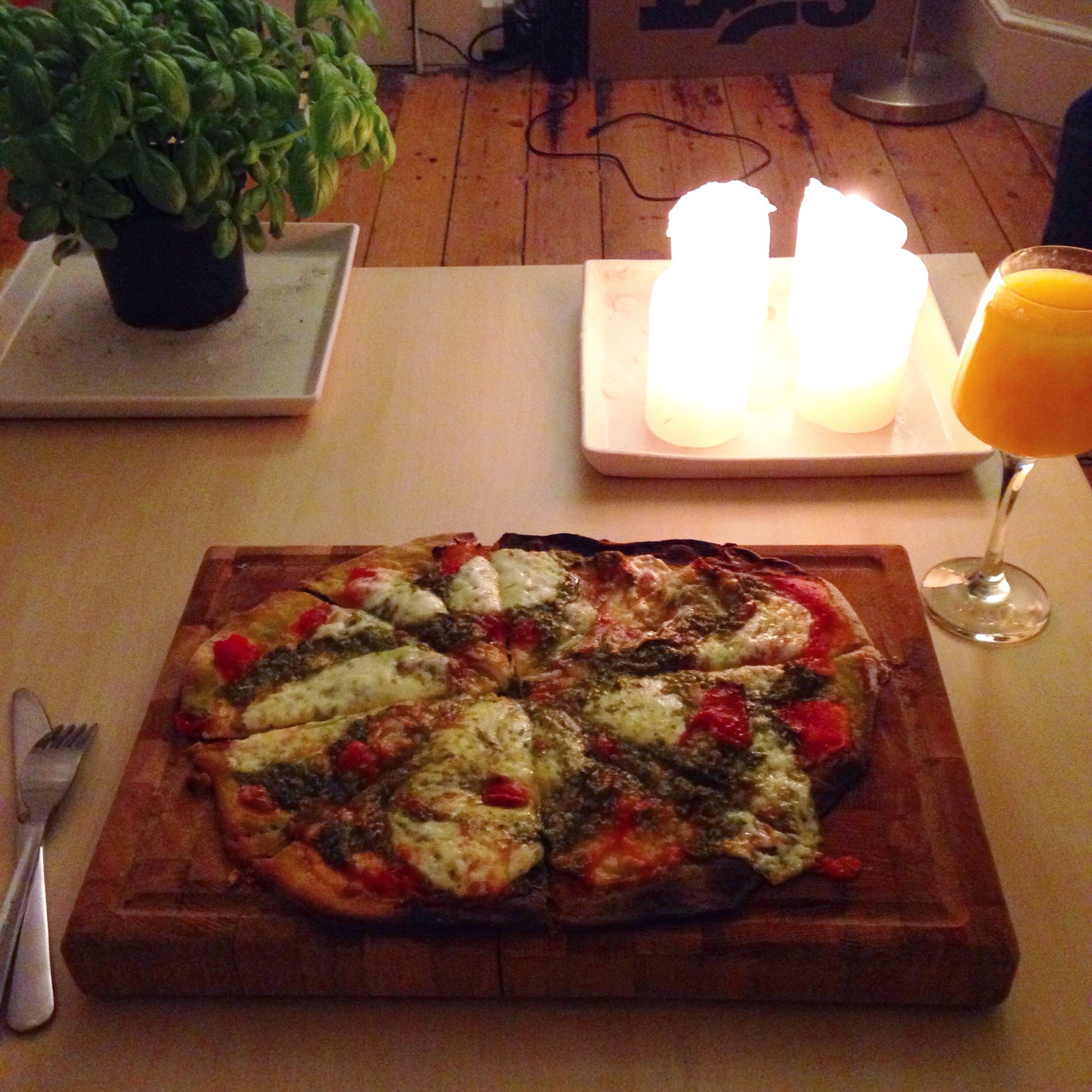 Spread over as much garlic as you fancy, but remember after being roasted it will be seriously mellow. Add a bit of passata or pizza sauce, a good few dollops of pesto, and some dried or fresh rosemary, and a pinch of oregano and thyme. Slap some mozzarella on top and stick back in the oven for about 10/12 minutes.
